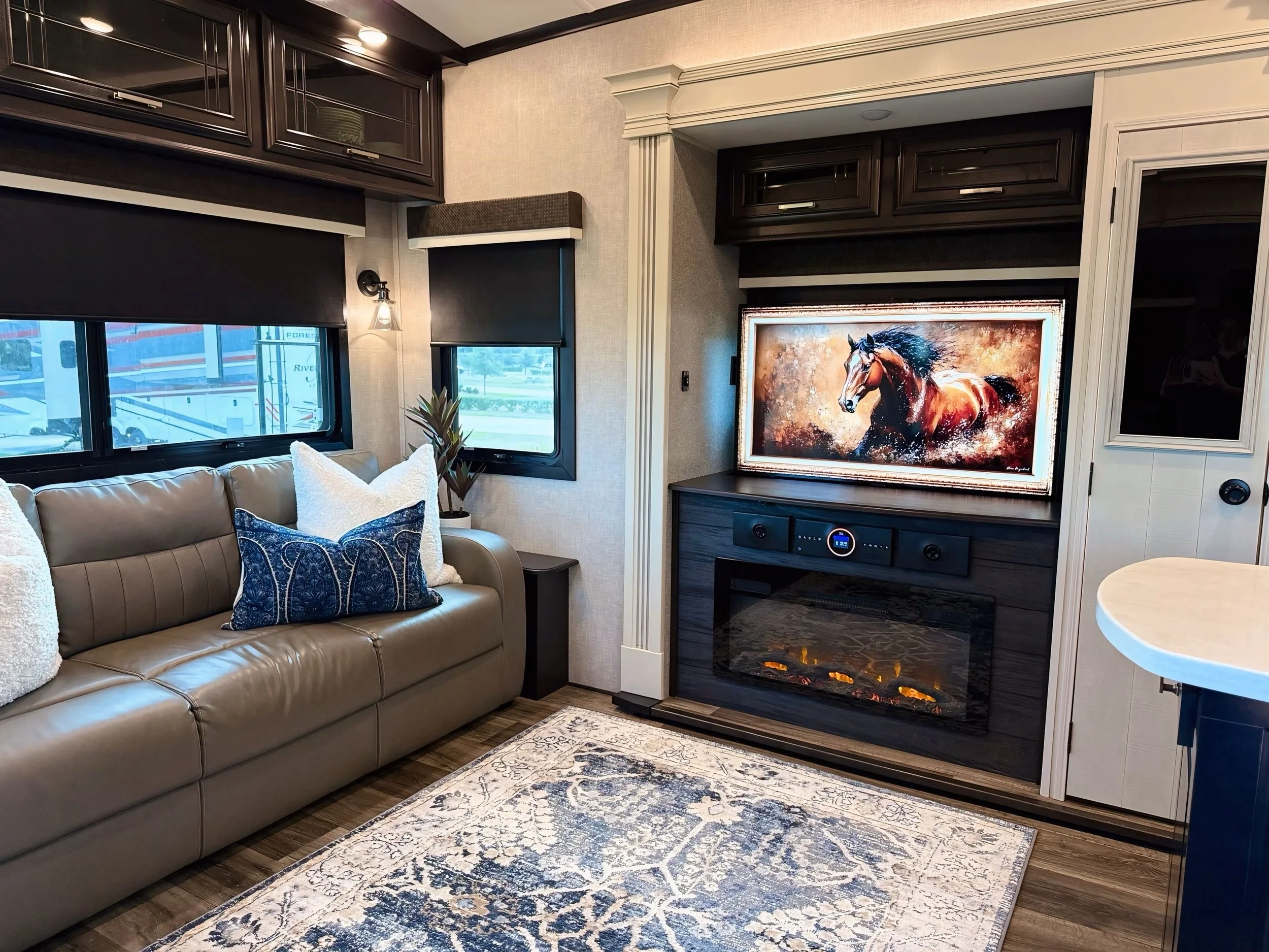 Our 35’ luxury RV can be delivered and set up at WEC, HITS, or your preferred campground, property, or farm in the Central Florida area. Our RV allows you to immerse yourself in the atmosphere of local equestrian events while offering a serene and inviting escape to unwind after a long day at the show grounds!